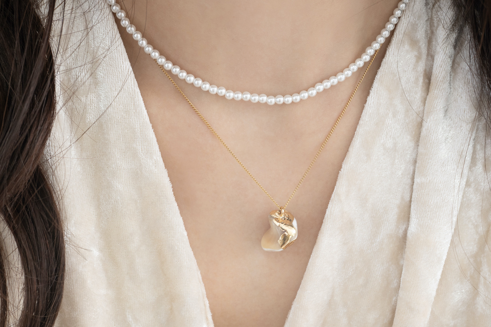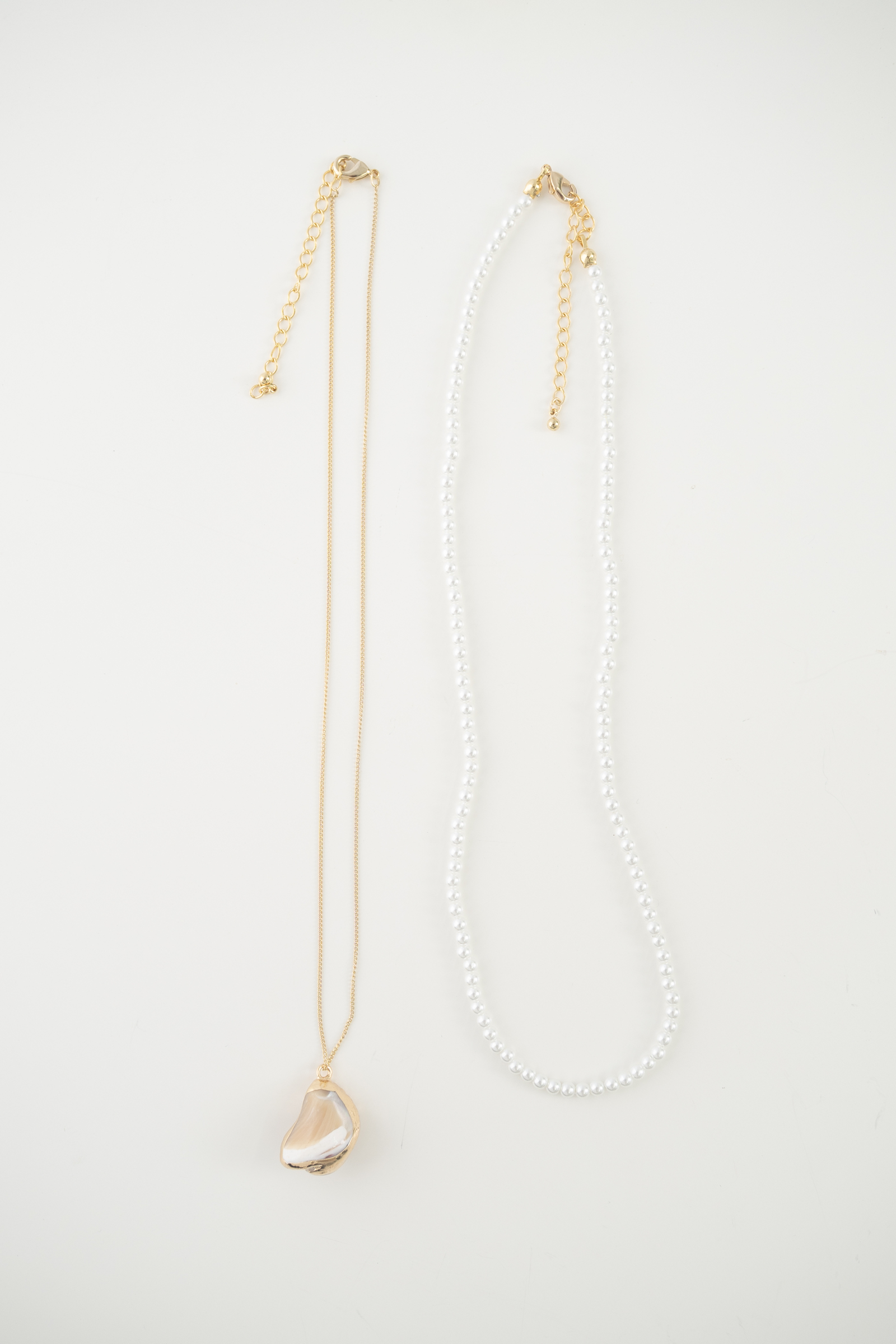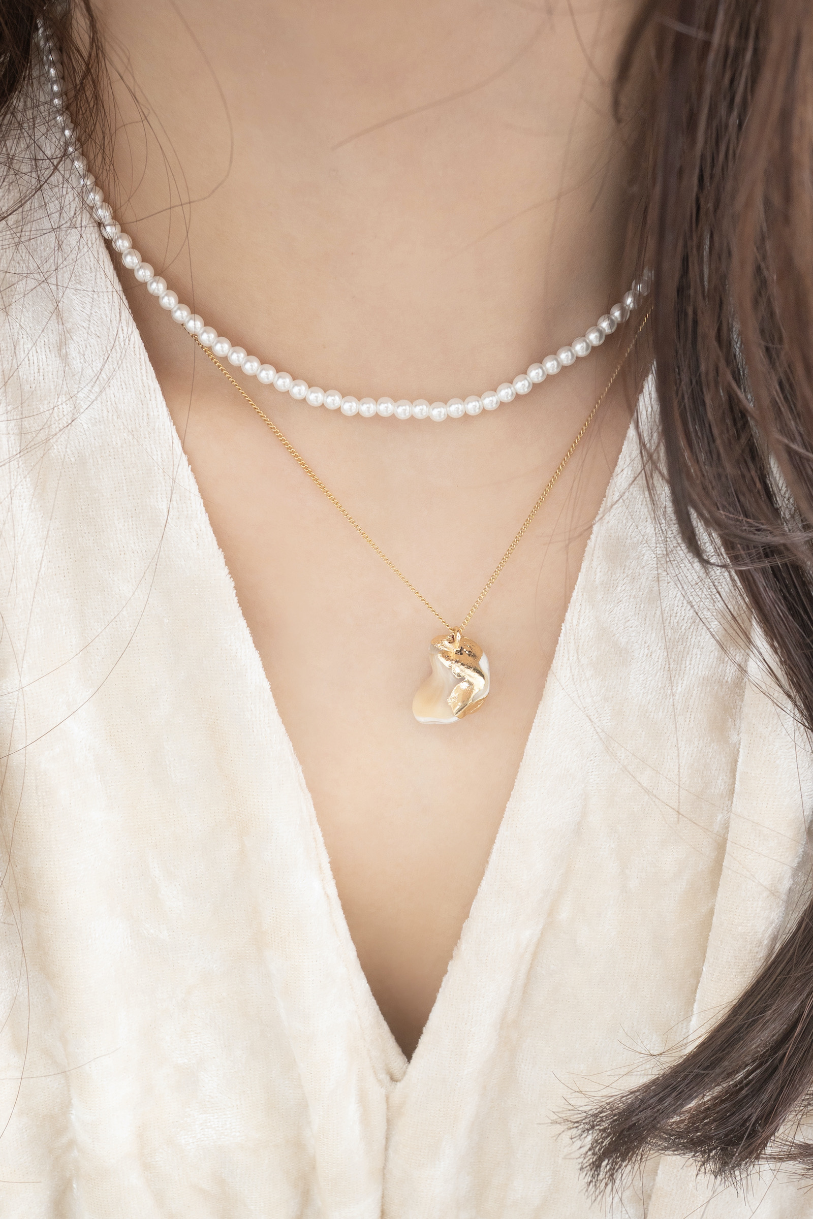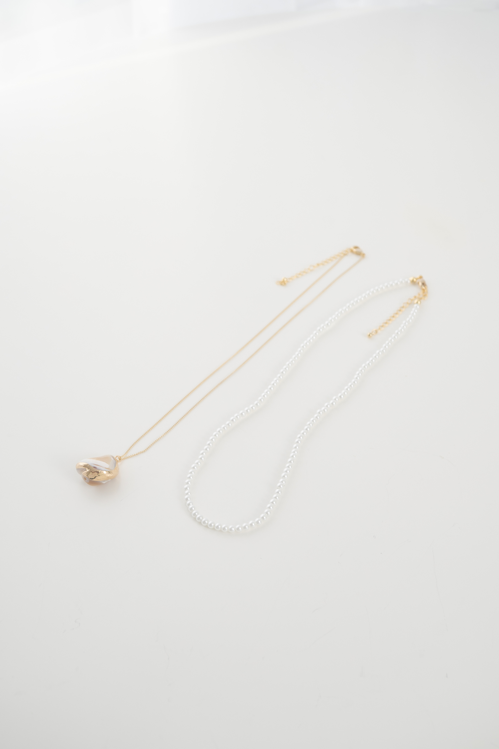 たっぷりついた小さな樹脂パールのネックレスと、ゴールドコーティングされたシェルのネックレス。