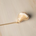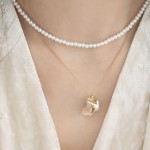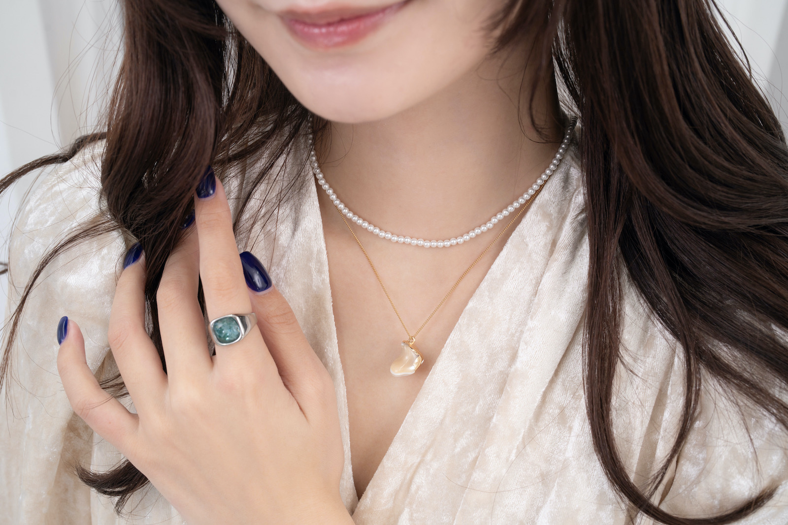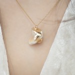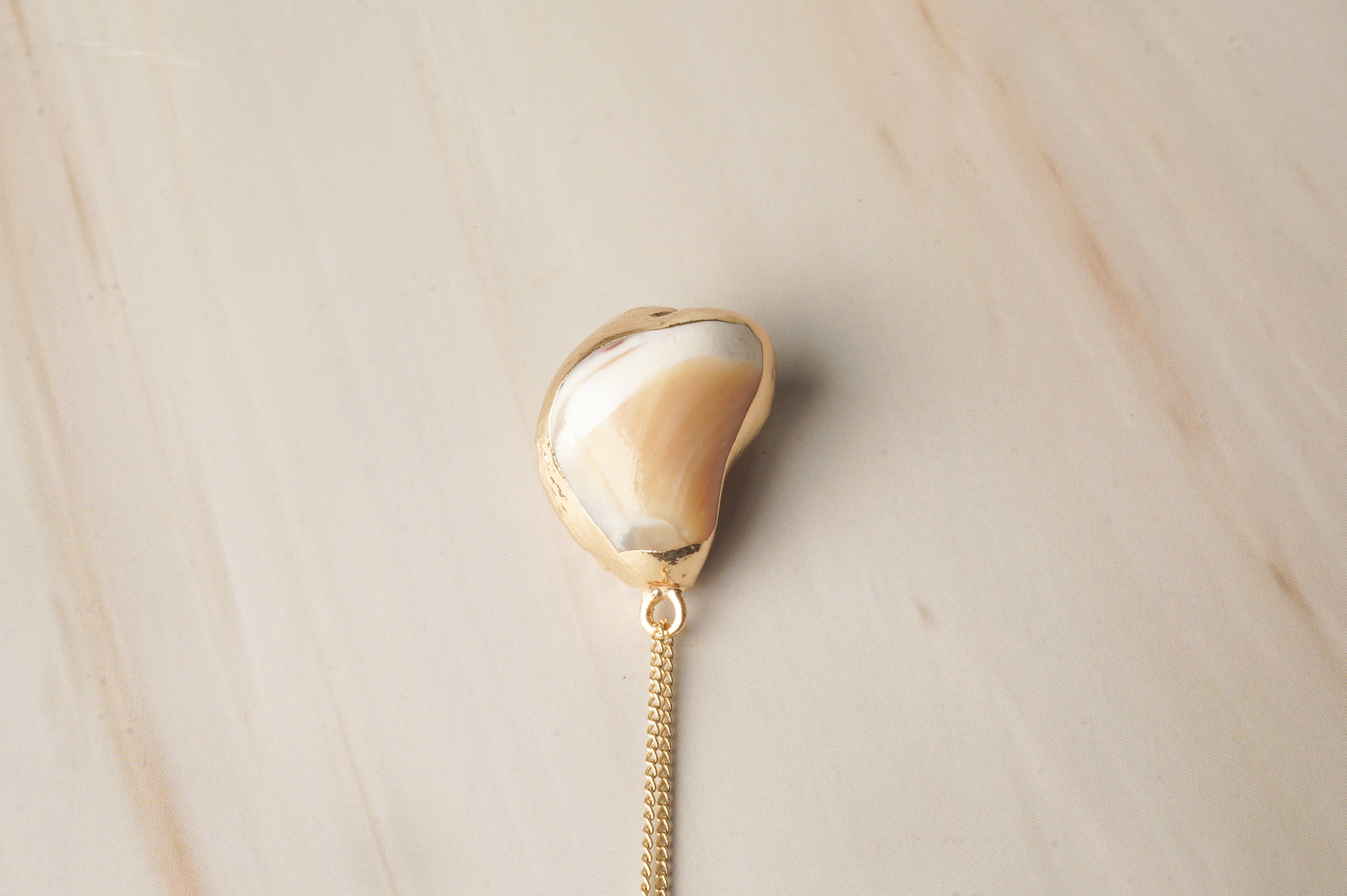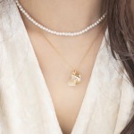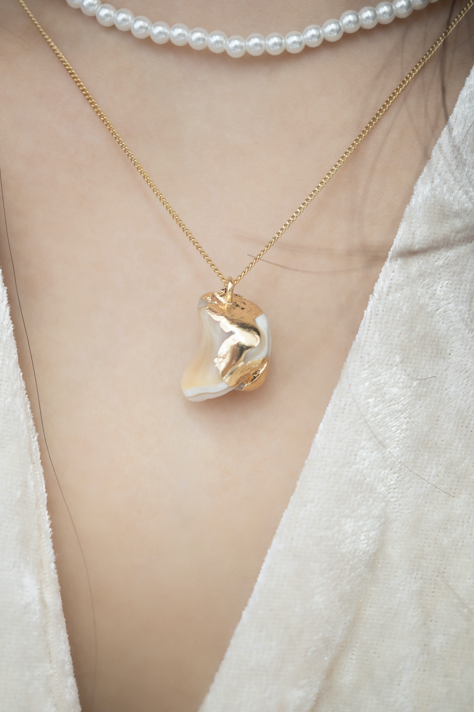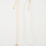 たっぷりついた小さな樹脂パールのネックレスと、ゴールドコーティングされたシェルのネックレス。