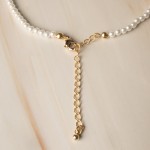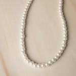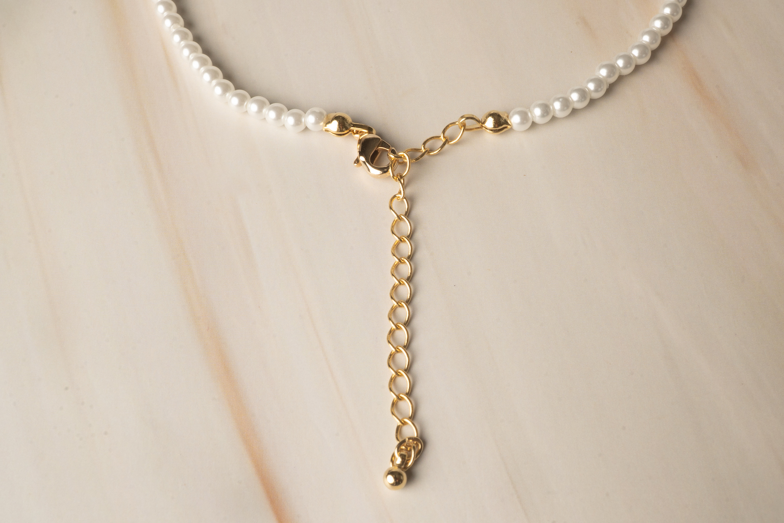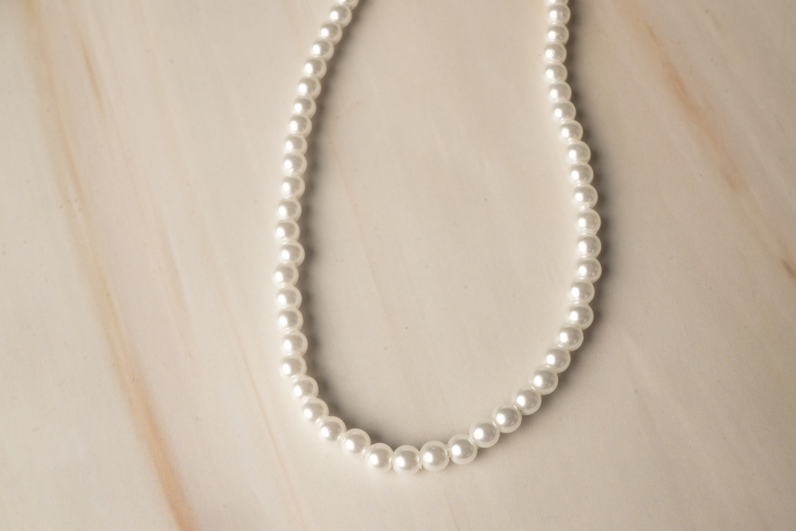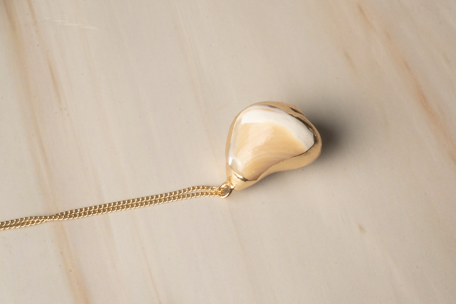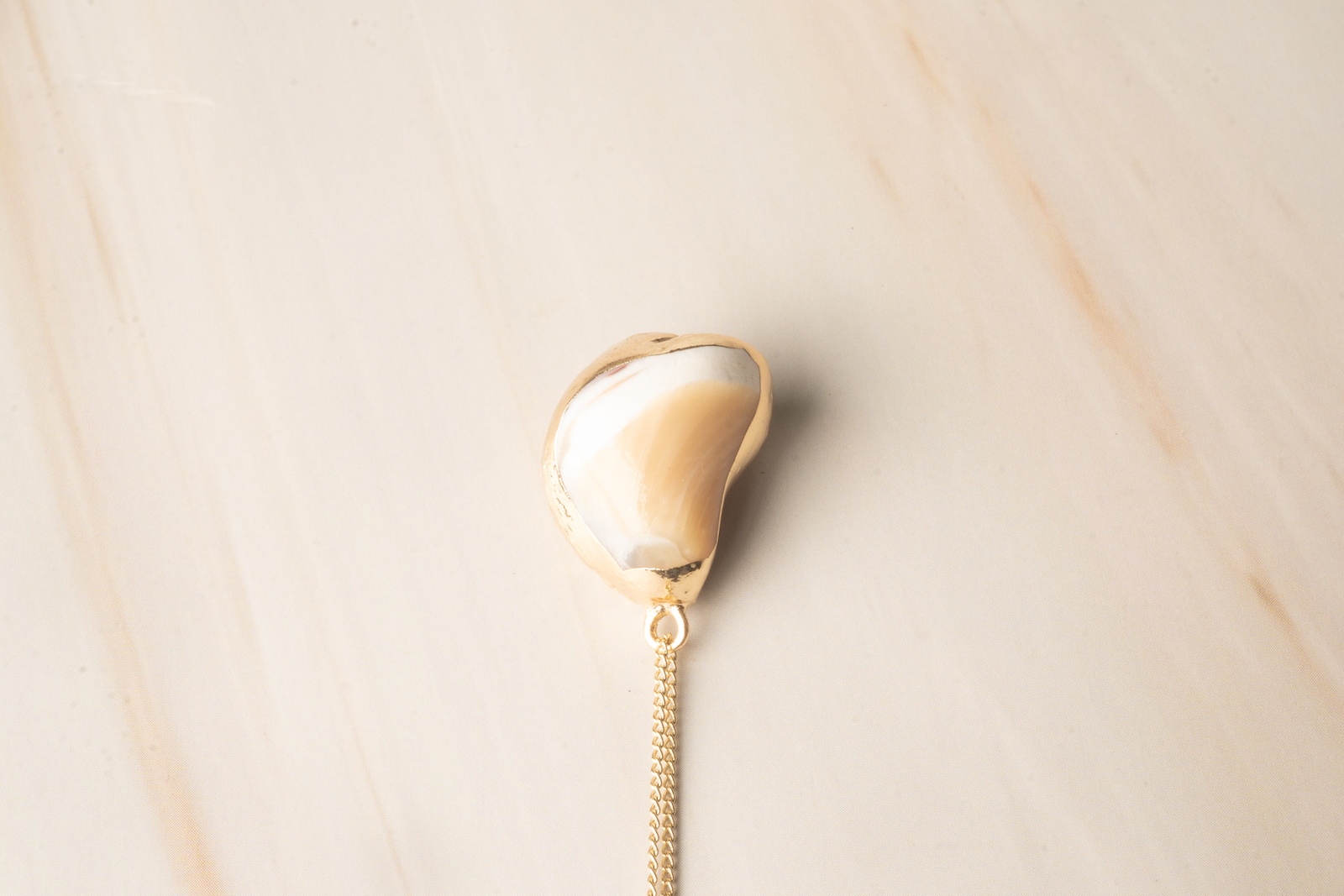 たっぷりついた小さな樹脂パールのネックレスと、ゴールドコーティングされたシェルのネックレス。