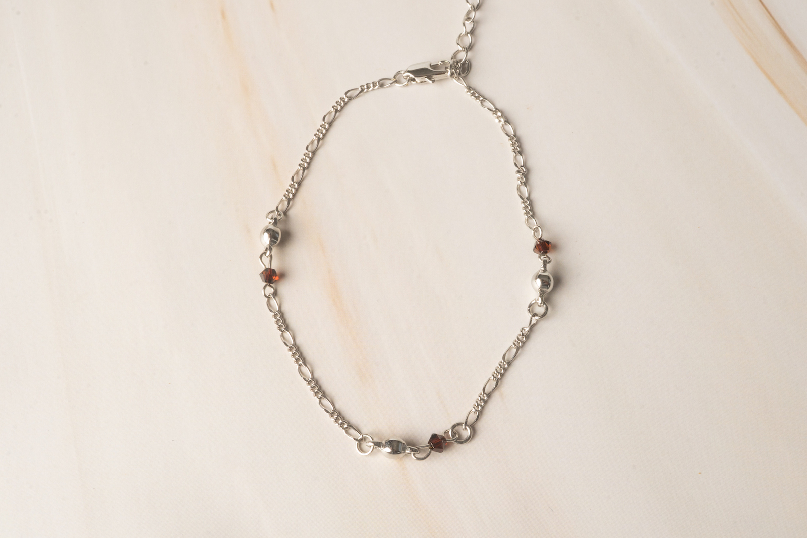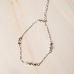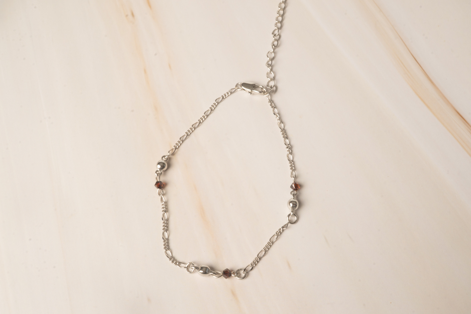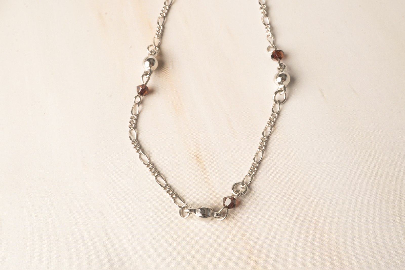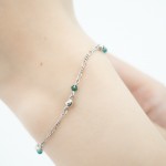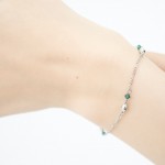 小さなキラッと光るクリスタルガラスと小さな真鍮のパーツを細い繊細なチェーンで繋いだブレスレット。