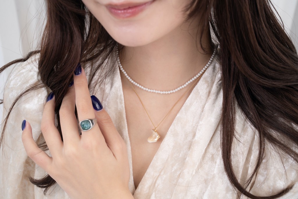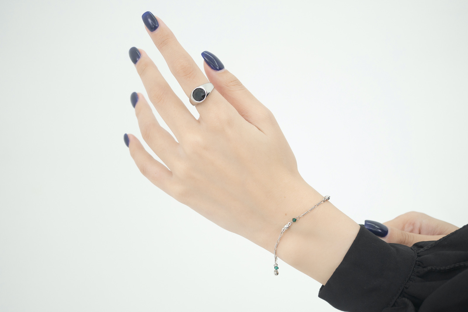 繊細なチェーンやクリスタルを使った美しいブレスレットや、メンズサイズの展開もあるリングもございます。