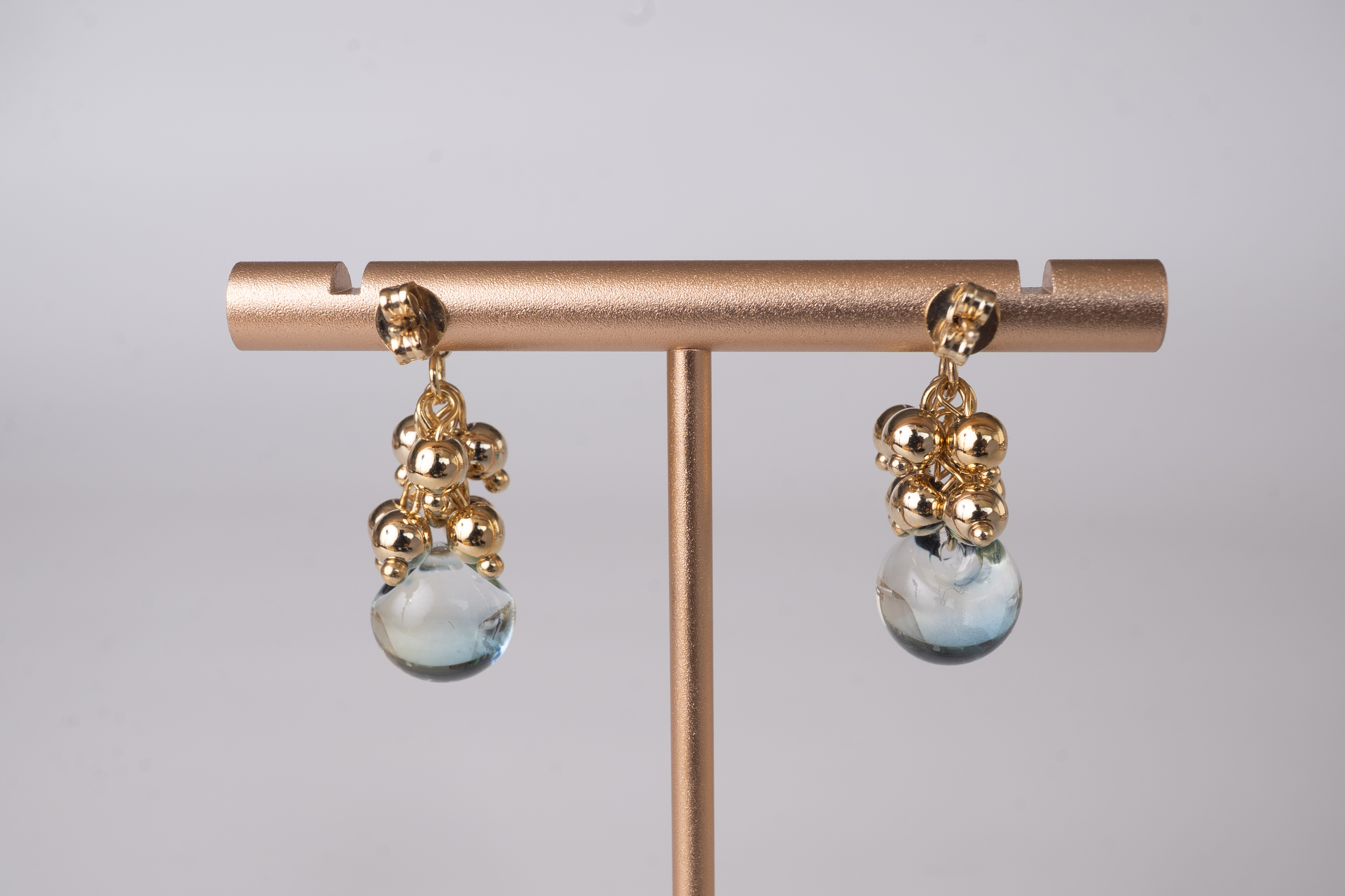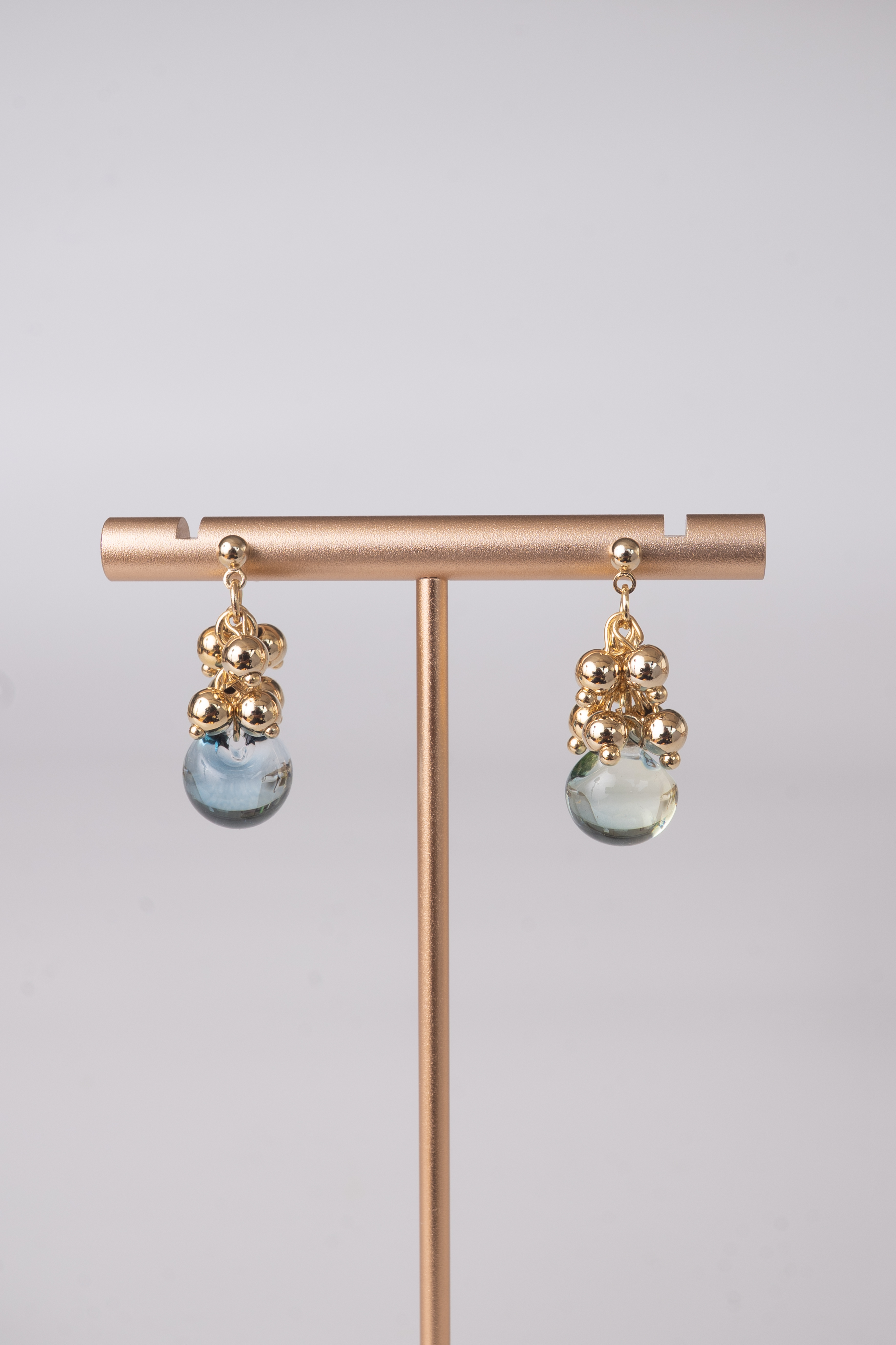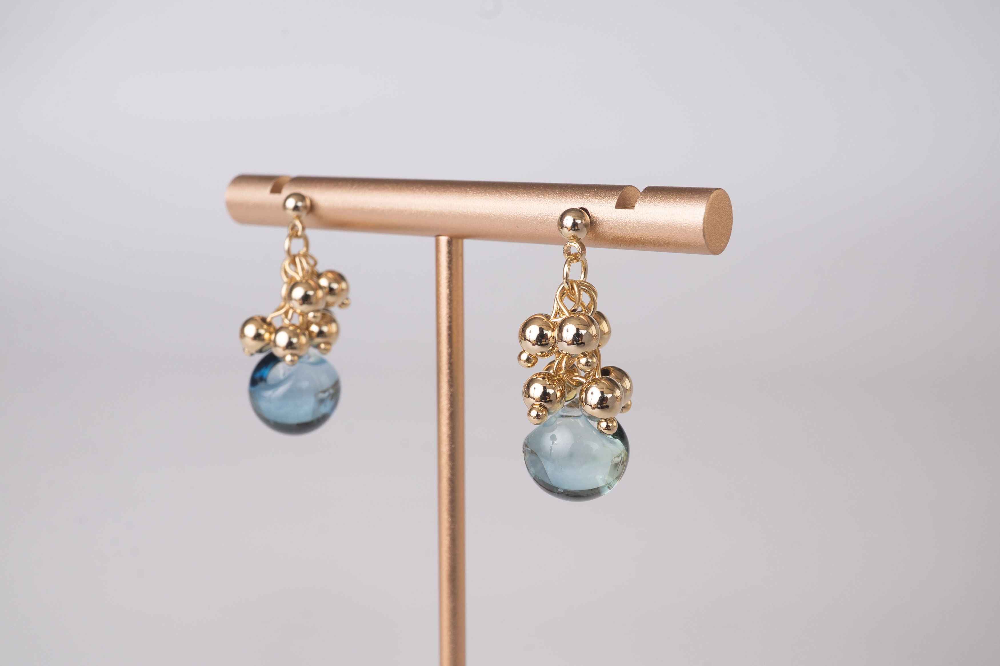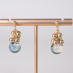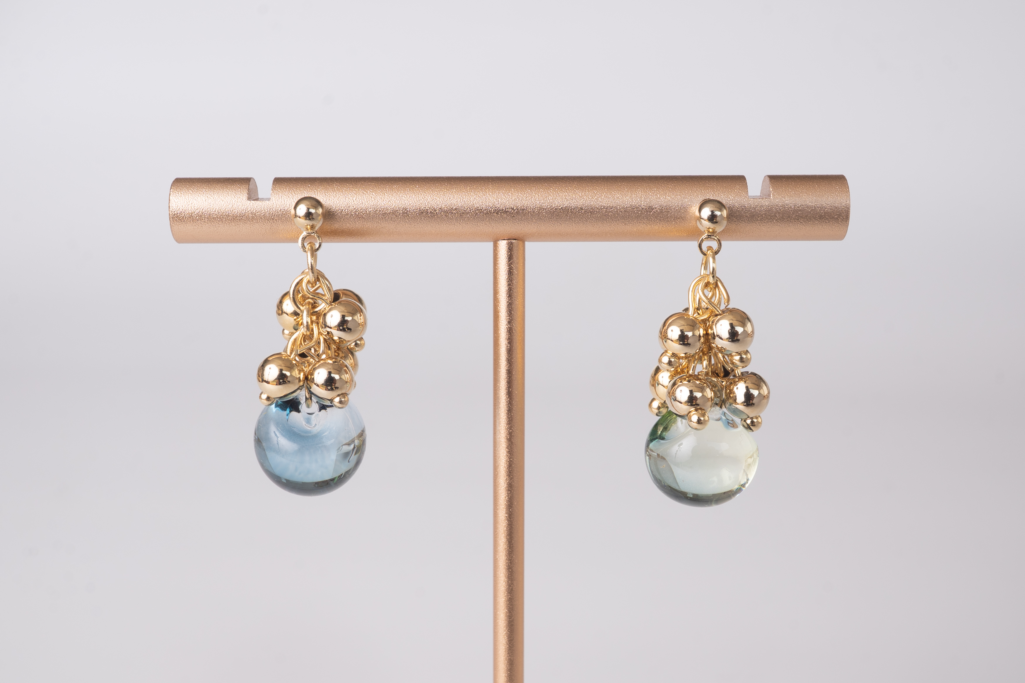 綺麗なミックスブルーグリーンのガラスに、小さな銅玉をたくさん繋いでできた耳飾り。